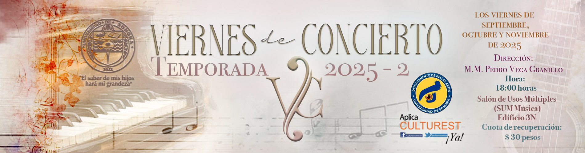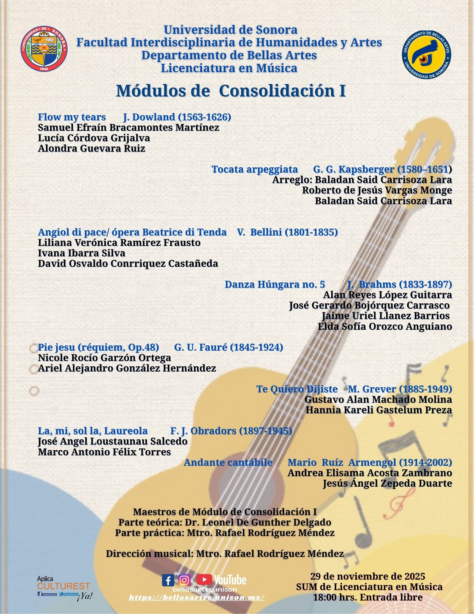 Licenciatura en Música de La Universidad de Sonora invita a disfrutar de la Presentación de Fin de Cursos del Programa MODULOS DE CONSOLIDACIÓN I Estudiantes el Maestro Rafael Rodríguez Méndez.SUM de Licenciatura en Música de La Universidad de...