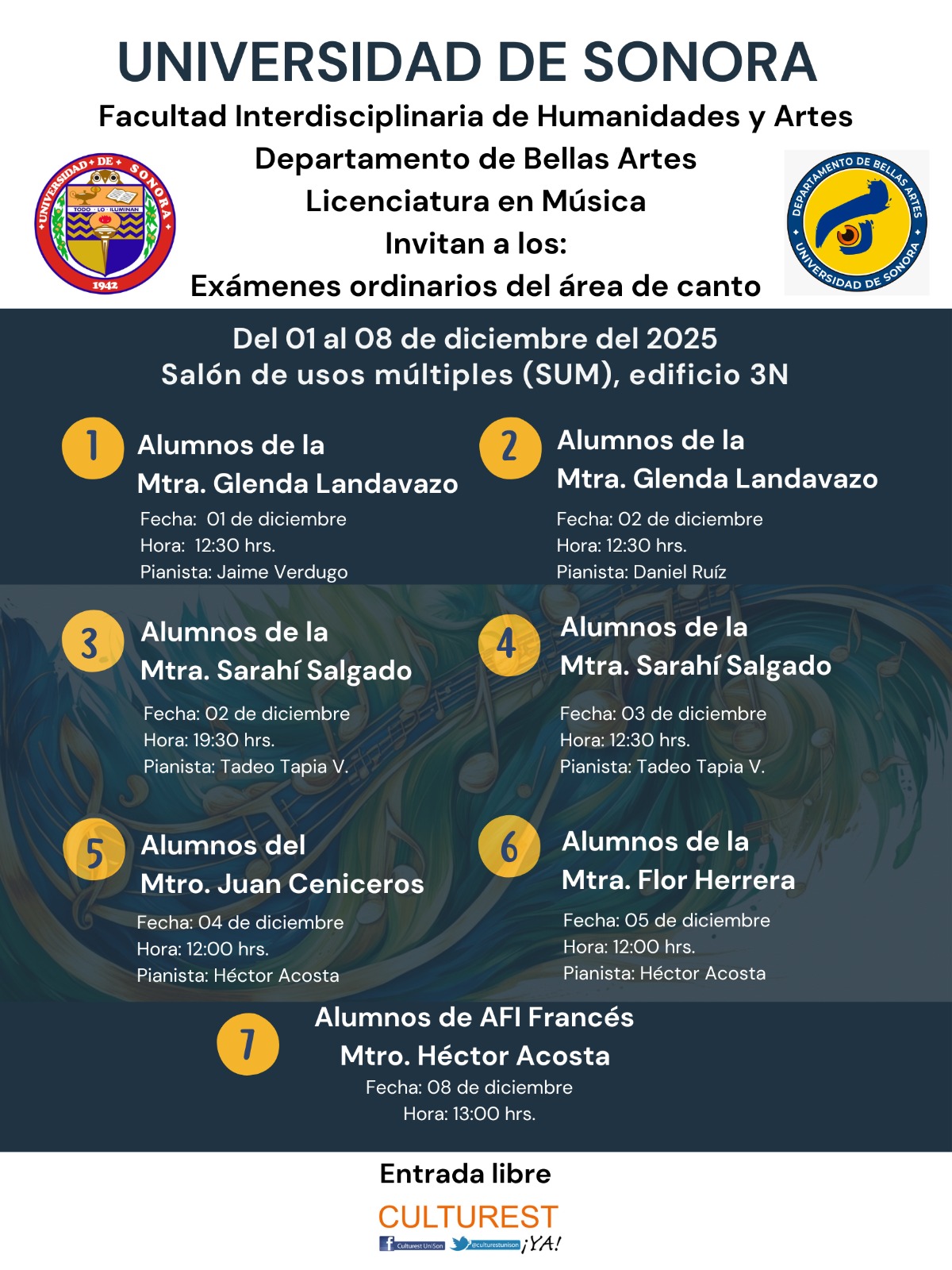 Exámenes ordinarios del área de canto de los alumnos de la Licenciatura en Música de La Universidad de Sonora