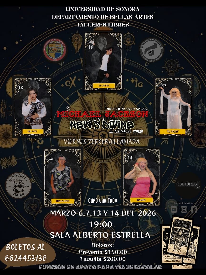 Viernes Tercera Llamada EL MICHAEL JACKSON DE LA NEW'S DIVINE De Alejandro Román Dirección Ever Salas Preventa $150 Taquilla $200 6624453138 6,7,13 y 14 de marzo, 19:00, SUM Sala Alberto Estrella ...