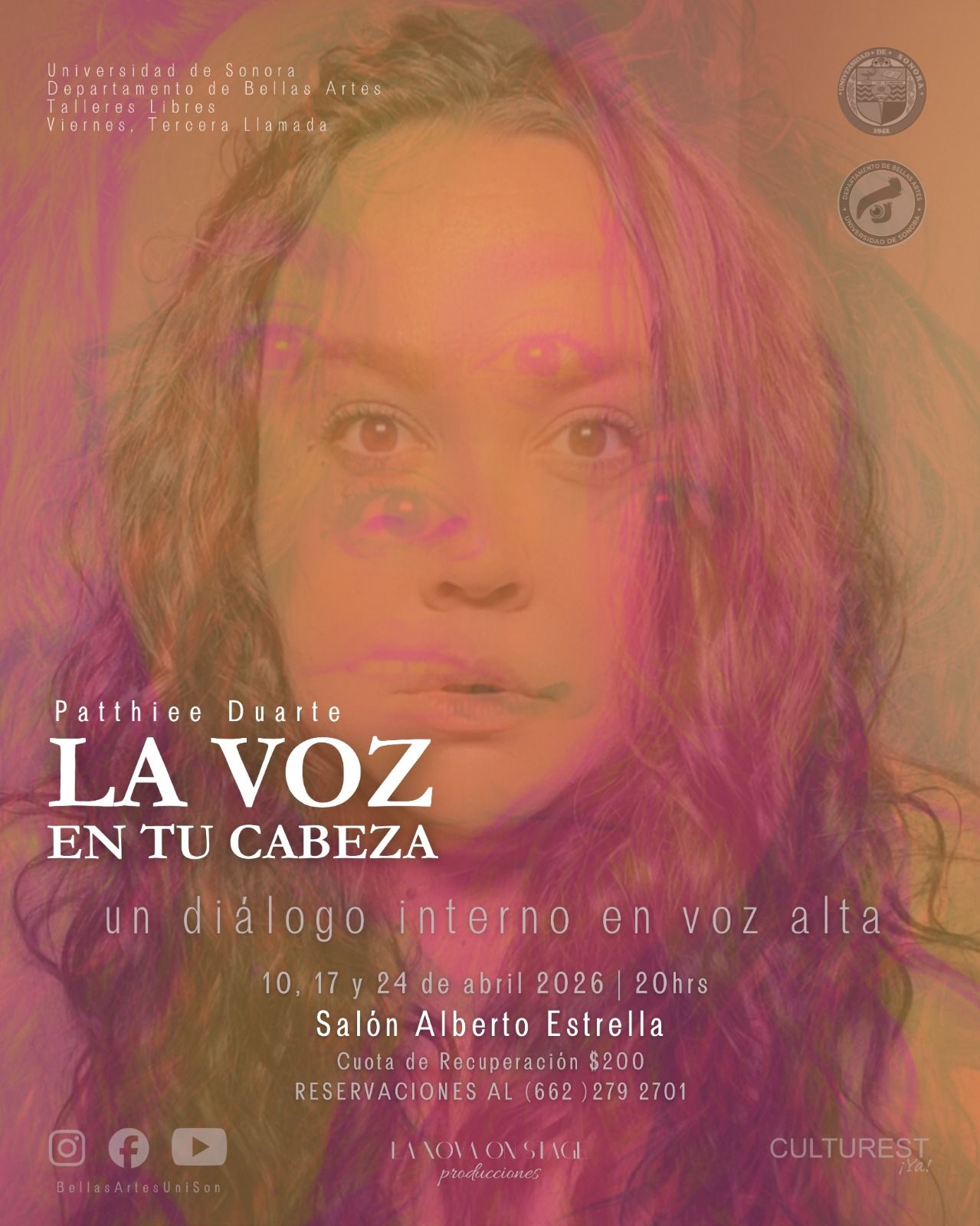 Viernes Tercera Llamada, Talleres Libres invitaLA VOZ EN TU CABEZA*Un diálogo interno en voz alta*Dirección Patthiee Duarte 10, 17 y 24 de abril, 20:00 horas, Salón Alberto EstrellaTaquilla:General $200Reservación 6622792701