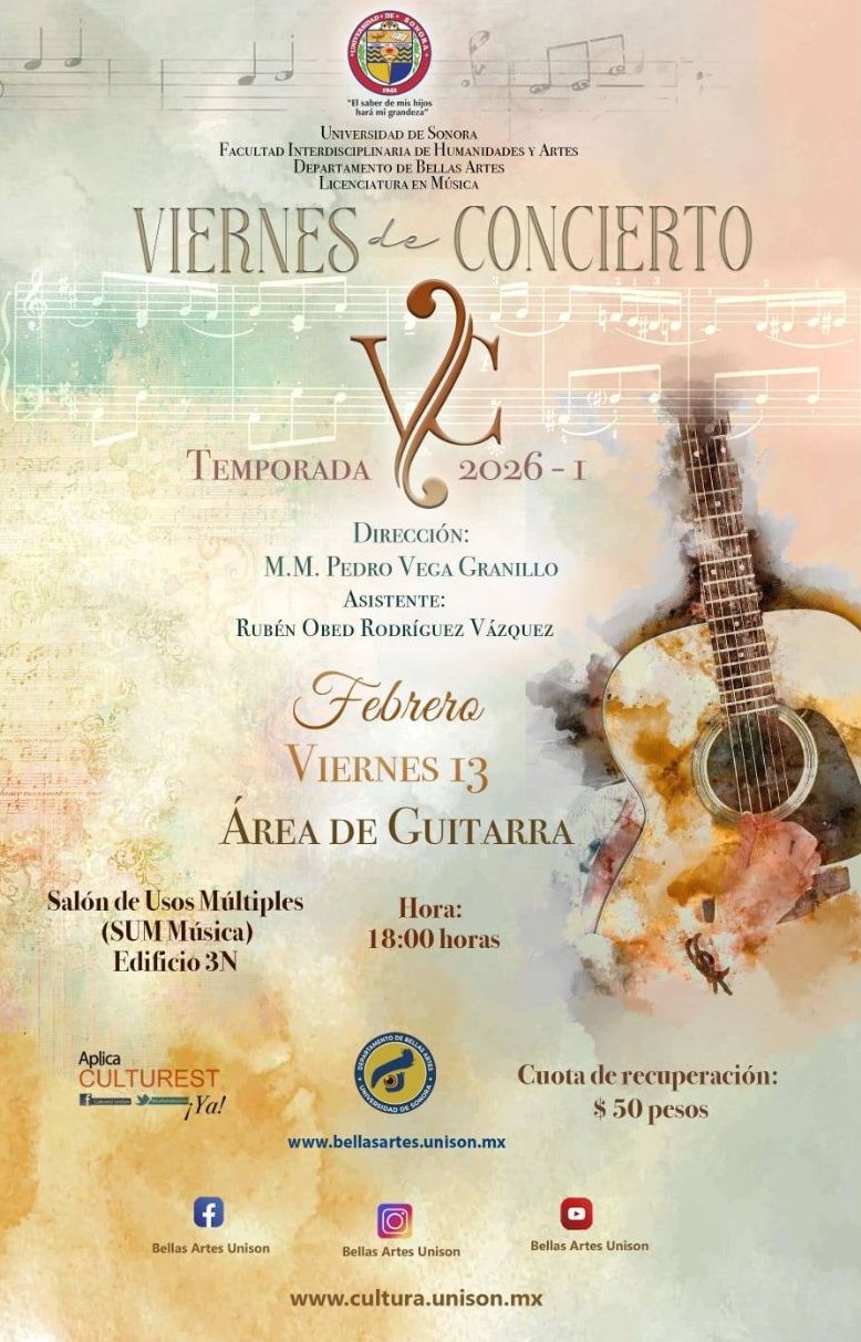 Viernes 13 de febrero, 18:00 horas, Cuota de recuperación $50, SUM del Edificio 3N de Licenciatura en Música de la Universidad de Sonora