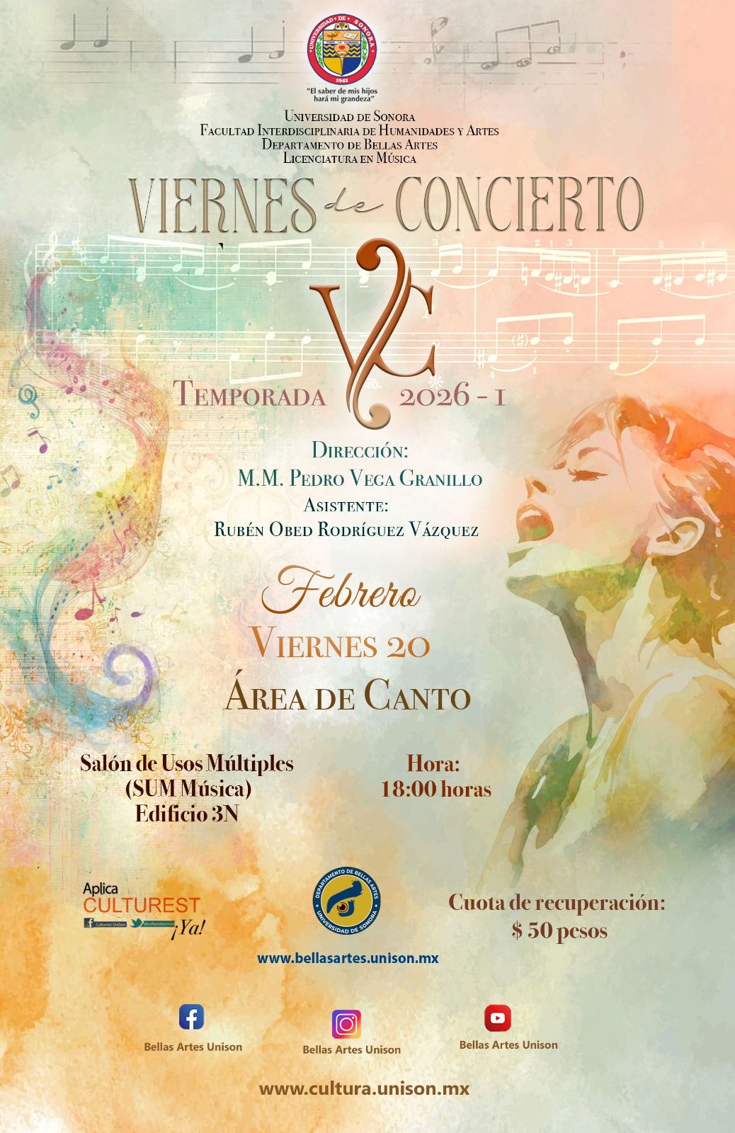 Viernes 20 de febrero, 18:00 horas,  Cuota de recuperación $50, SUM del Edificio 3N de Licenciatura en Música de La Universidad de Sonora