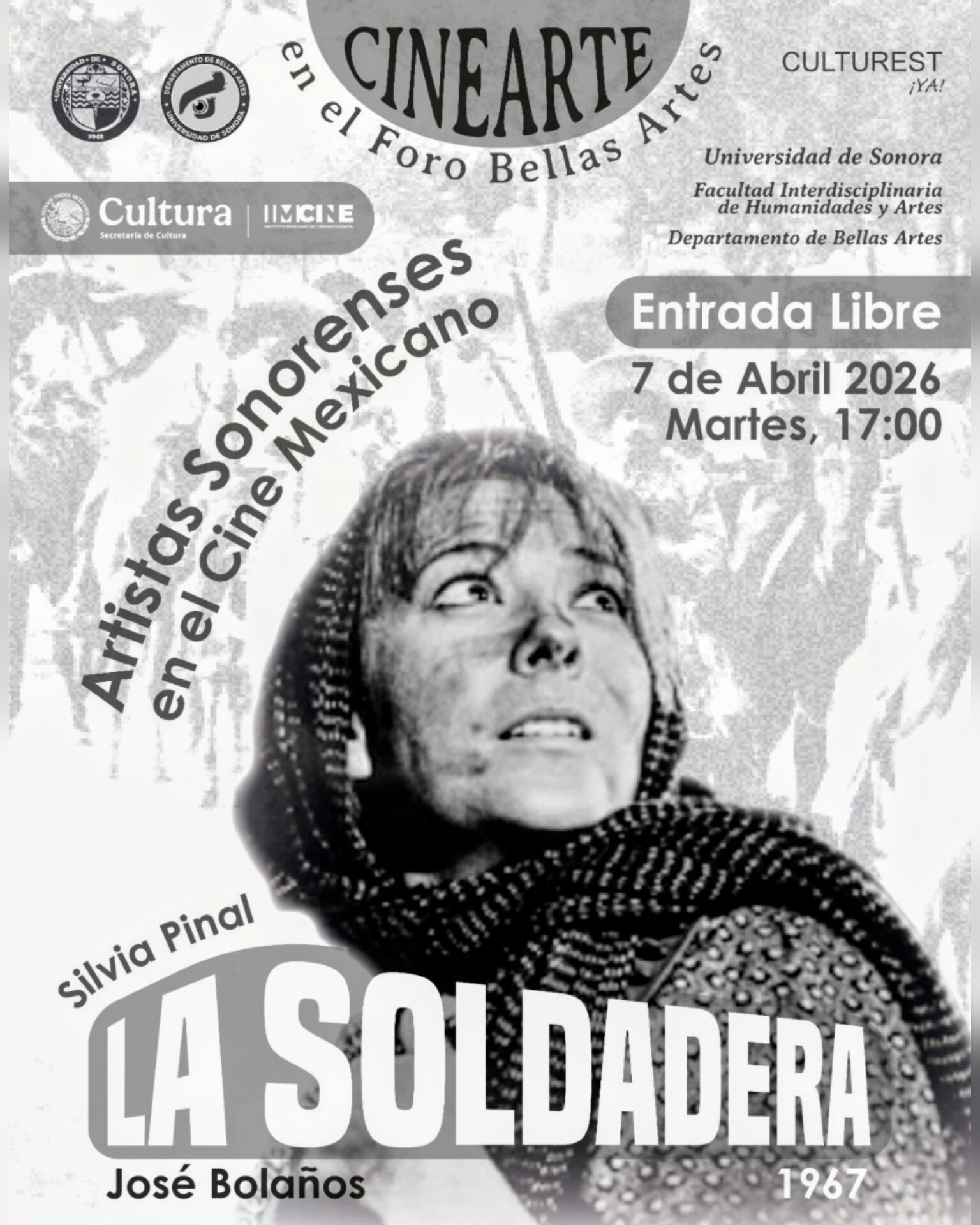CINE ARTE MEXICANO Artistas sonorenses en el Cine Mexicano, LA SOLDADERA (1967) SILVIA PINAL 7 abril, 2026Juliana Rodriguez CINE ARTE MEXICANO Artistas sonorenses en el Cine Mexicano LA SOLDADERA (1967) SILVIA PINAL Entrada libre los martes 7 de abril, 17:00 horas, entrada gratuita, Foro Bellas Artes