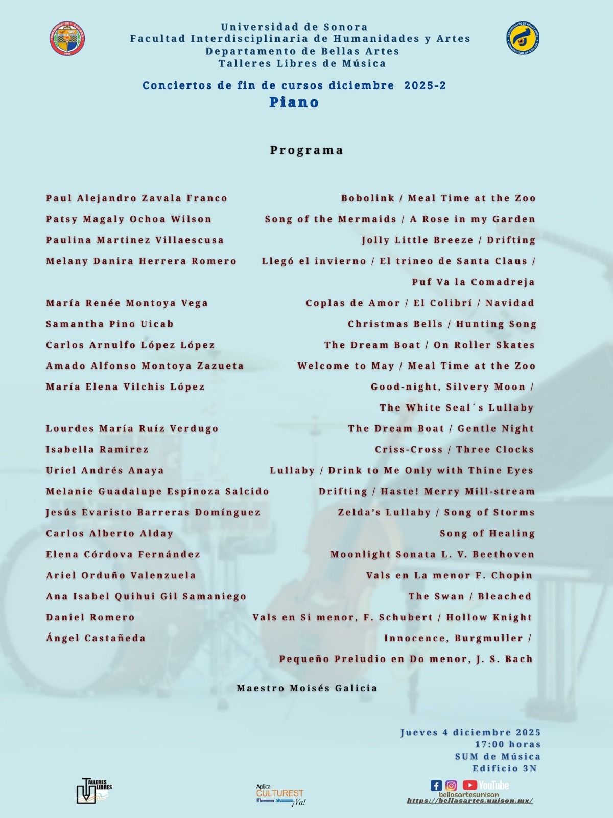 Concierto Piano 8 diciembre, 2025Juliana Rodriguez Conciertos de fin de cursos diciembre 2025-2 Talleres Libres de Música invita:PianoAlumnos del Maestro Moisés Galicia