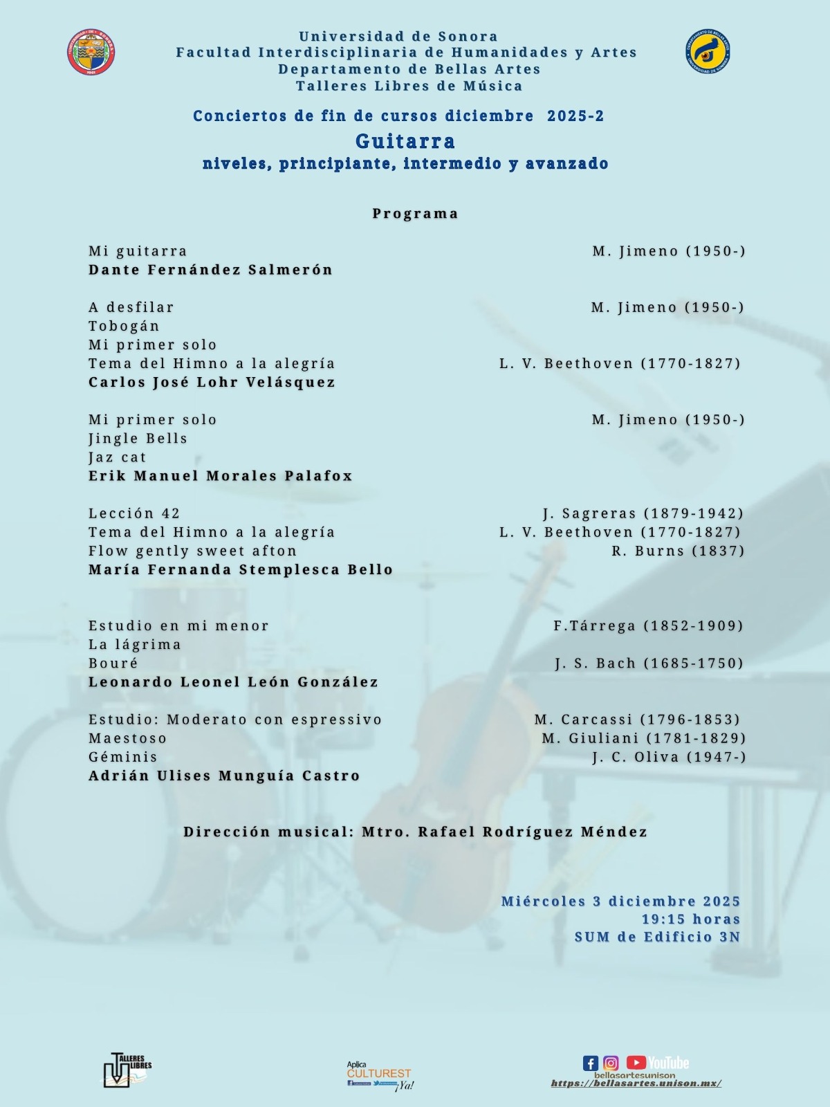 Conciertos Guitarra 8 diciembre, 20258 diciembre, 2025Juliana Rodriguez Conciertos de fin de cursos diciembre 2025-2 Talleres Libres de MúsicaGuitarra niveles principiante, intermedio y avanzadoAlumnos del Maestro Rafael Rodríguez Méndez