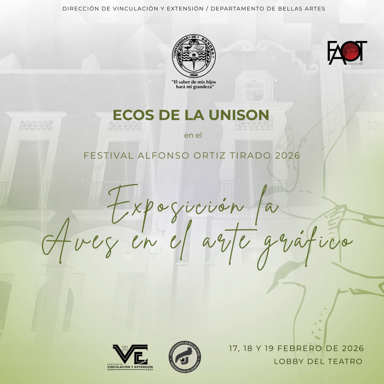 ECOS DE LA UNISON en el Festival Alfonso Ortiz Tirado 2026 AVES EN EL ARTE GRÁFICO 16 febrero, 202616 febrero, 2026Juliana Rodriguez ECOS DE LA UNISON En el Festival Alfonso Ortiz Tirado 2026 AVES EN EL ARTE GRÁFICO 17, 18, 19 de febrero, Lobby Teatro Emiliana de Zubeldía