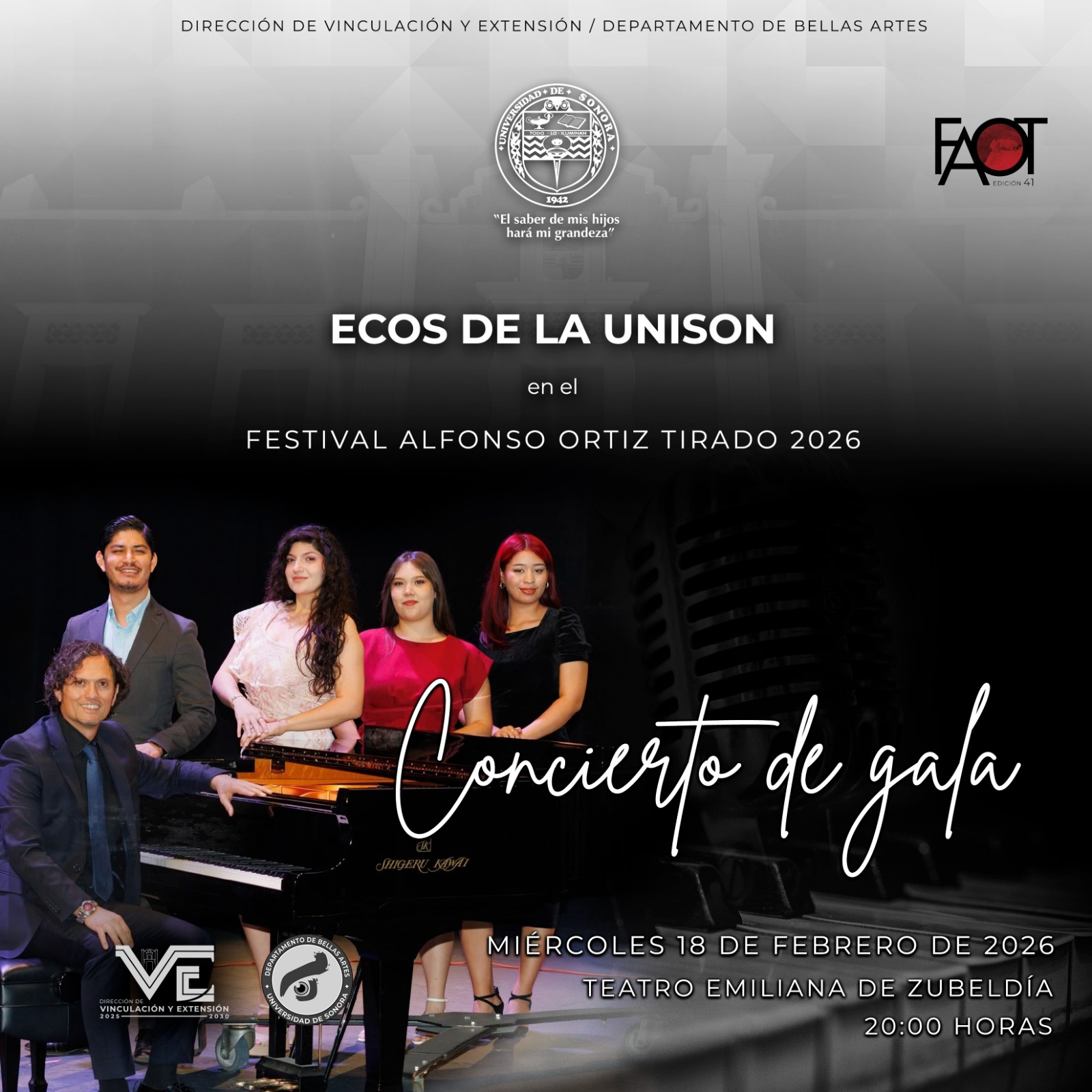 ECOS DE LA UNISON en el Festival Alfonso Ortiz Tirado 2026 CONCIERTO DE GALA 16 febrero, 202616 febrero, 2026Juliana Rodriguez ECOS DE LA UNISON En el Festival Alfonso Ortiz Tirado 2026 CONCIERTO DE GALAMiércoles 18 de febrero, 20:00 horas, Teatro Emiliana de Zubeldía