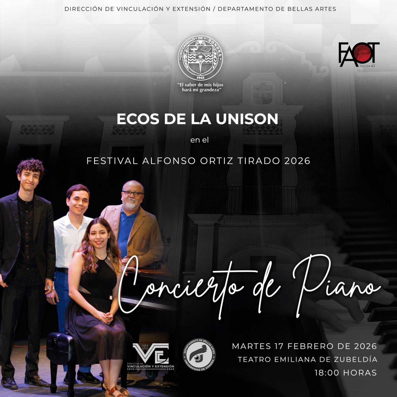 ECOS DE LA UNISON en el Festival Alfonso Ortiz Tirado 2026 CONCIERTO DE PIANO 16 febrero, 202616 febrero, 2026Juliana Rodriguez ECOS DE LA UNISON En el Festival Alfonso Ortiz Tirado 2026 CONCIERTO DE PIANO Martes 17 de febrero, 18:00 horas, Teatro Emiliana de Zubeldía