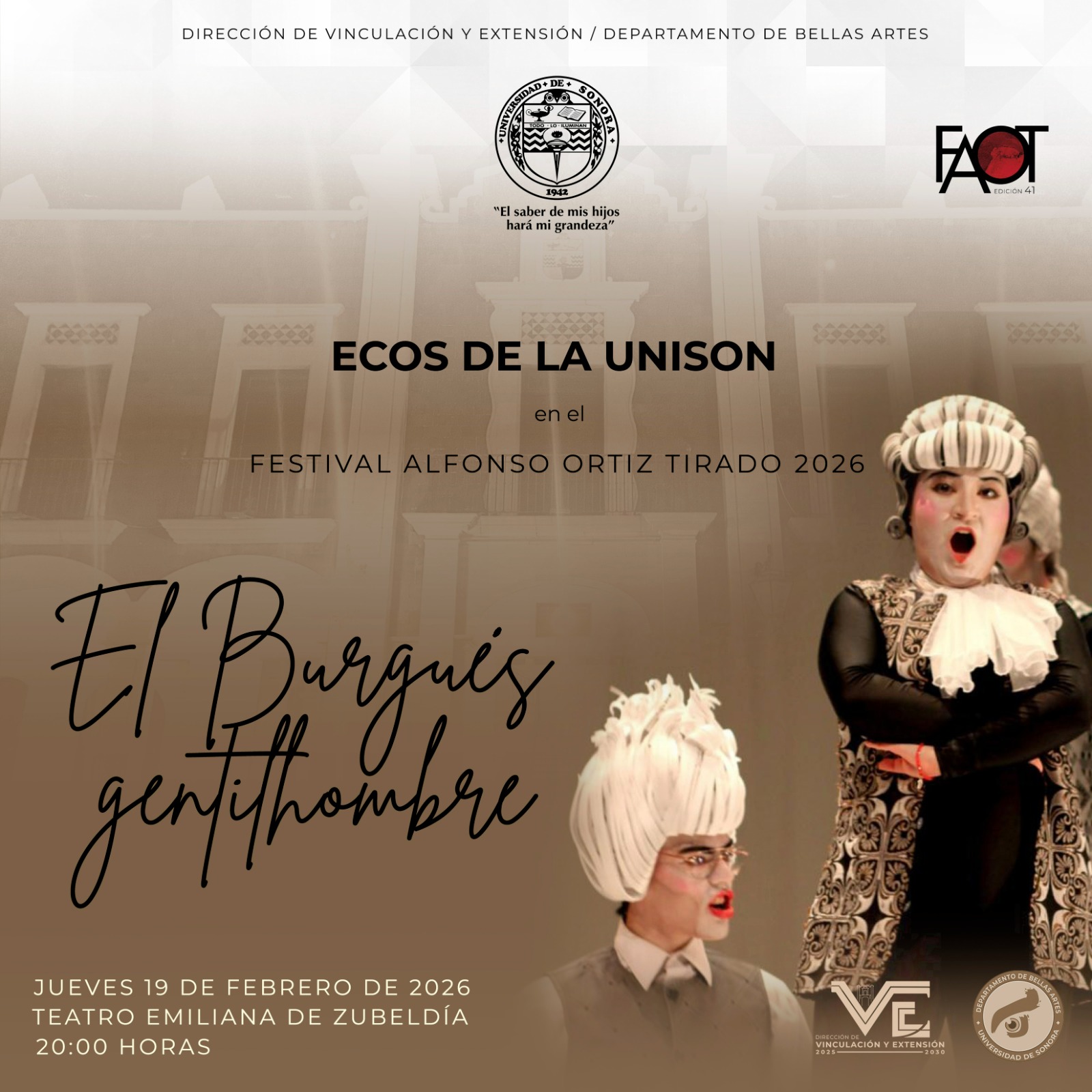 ECOS DE LA UNISON en el Festival Alfonso Ortiz Tirado 2026 EL BURGUES GENTILHOMBRE 16 febrero, 202616 febrero, 2026Juliana Rodriguez ECOS DE LA UNISON En el Festival Alfonso Ortiz Tirado 2026 EL BURGUES GENTILHOMBRE Jueves 19 de febrero, 20:00 horas, Teatro Emiliana de Zubeldía