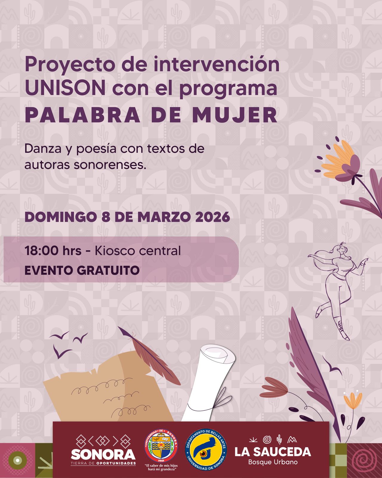 PROYECTO INTERVENCIÓN PALABRA DE MUJER 5 marzo, 2026Juliana Rodriguez PROYECTO INTERVENCIÓNPALABRA DE MUJERDanza y Poesía con textos de autoras sonorensesDirección Mtra. Silvia Salazar 8 de marzo 2026, 18:00 horas, Kiosco Central (Bosque Urbano la Sauceda)