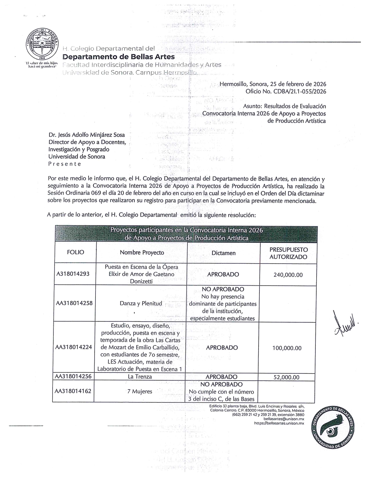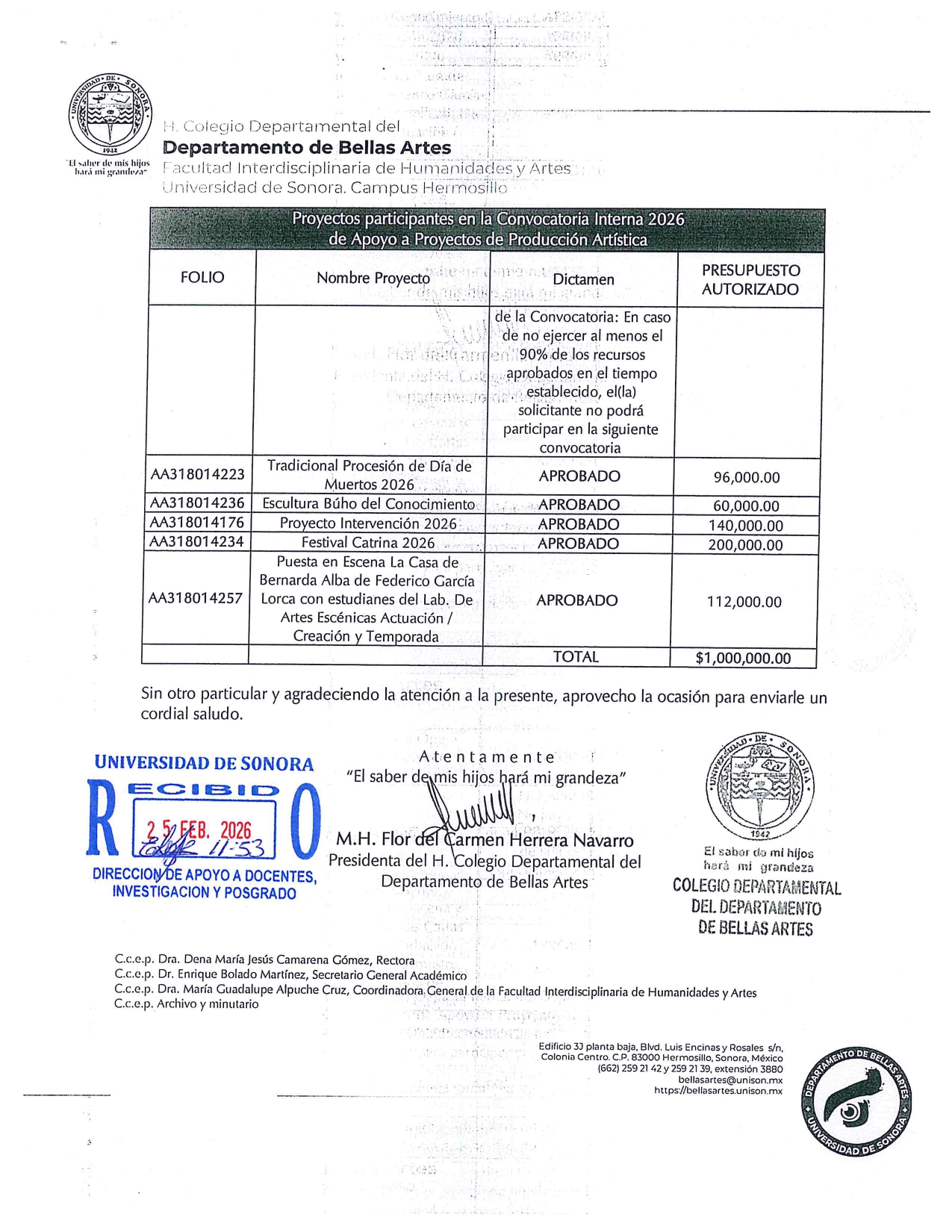 Resultados de Evaluación Convocatoria Interna 2026 de Apoyo a Proyectos de Producción Artística 25 febrero, 2026FLOR DEL CARMEN HERRERA NAVARRO